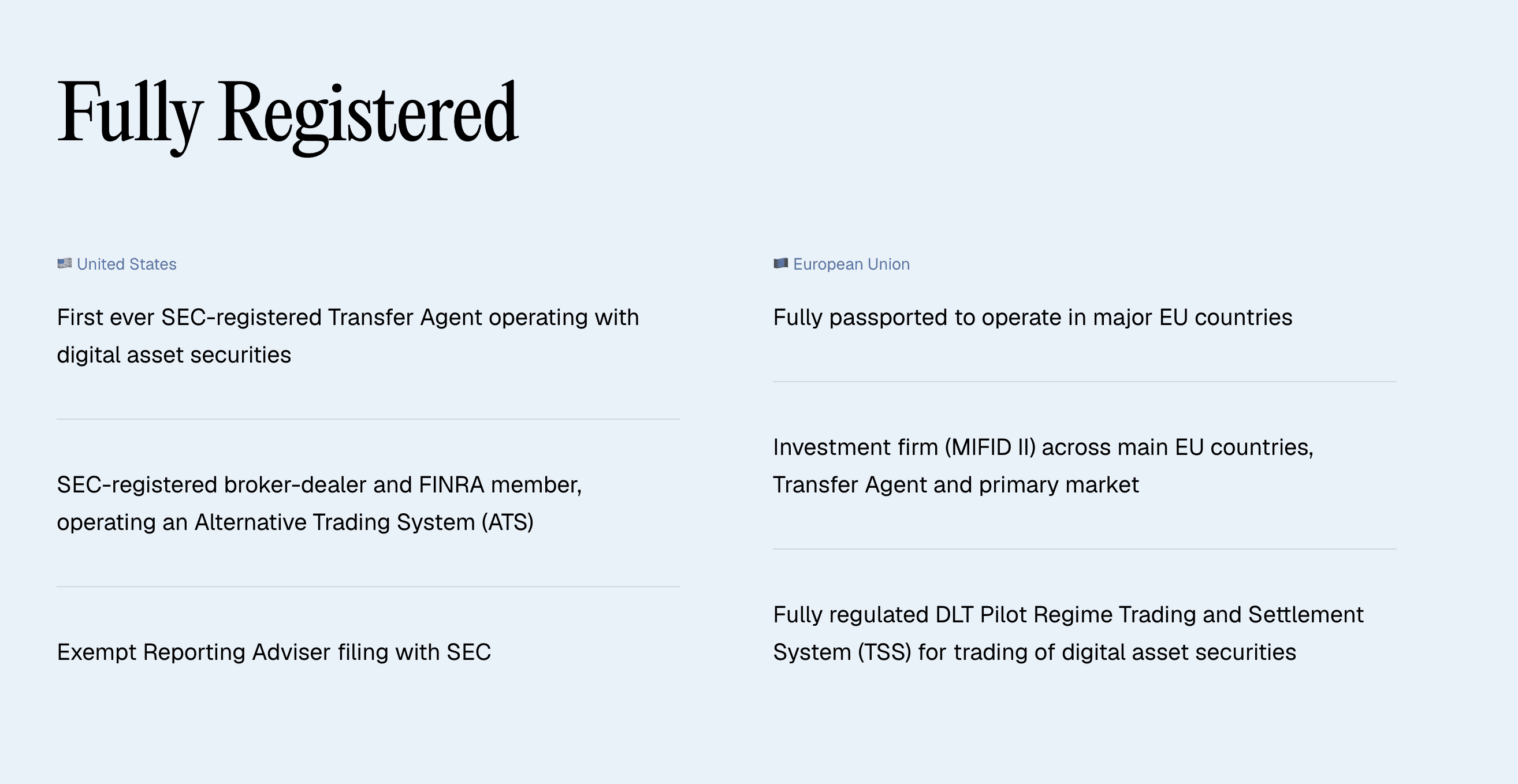 MacroCapital is a fully regulated digital asset securities firm and SEC-registered transfer agent. We are also a MiFID II investment firm passported across major EU countries, operating as a Transfer Agent with primary-market capabilities, and running a fully regulated DLT Pilot Regime Trading and Settlement System (TSS) for digital asset securities.